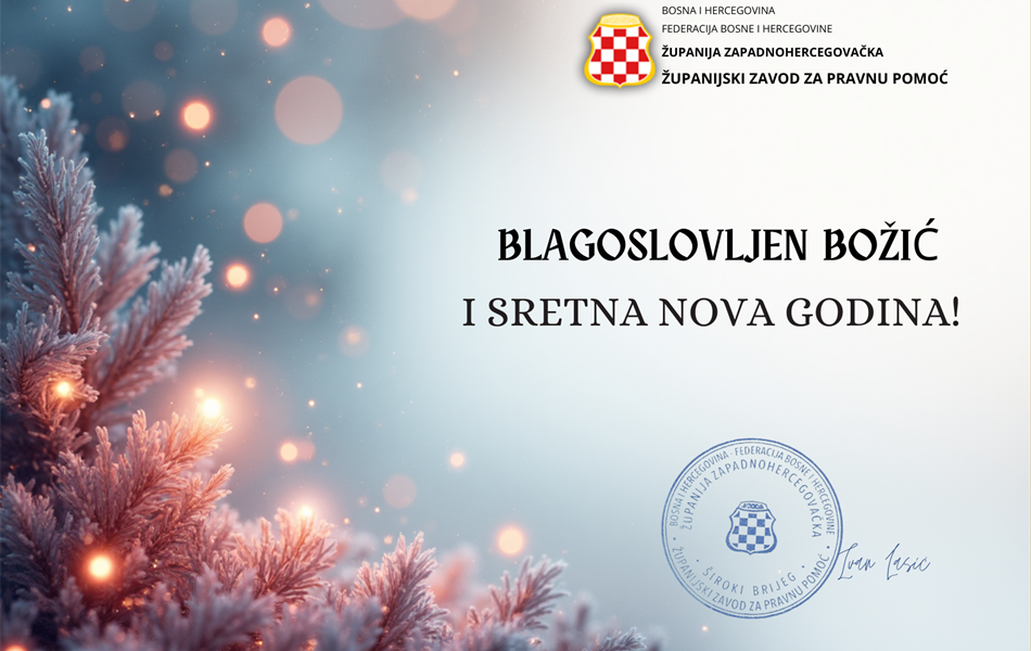 Čestit i blagoslovljen Božić te uspješnu nadolazeću 2026. godinu želi vam Županijski zavod za pravnu pomoć!